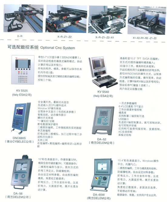 可選擇配置數(shù)控軸: 1、后擋料定位(X軸); 2、后擋料高度調節(jié)(R軸); 3、擋料塊獨立的橫向調節(jié)(Z軸); 4、工作臺加凸(V軸); 5、每個擋料塊X向獨立運動(X‘軸)(適用于公稱力為2500KN以下規(guī)格)。